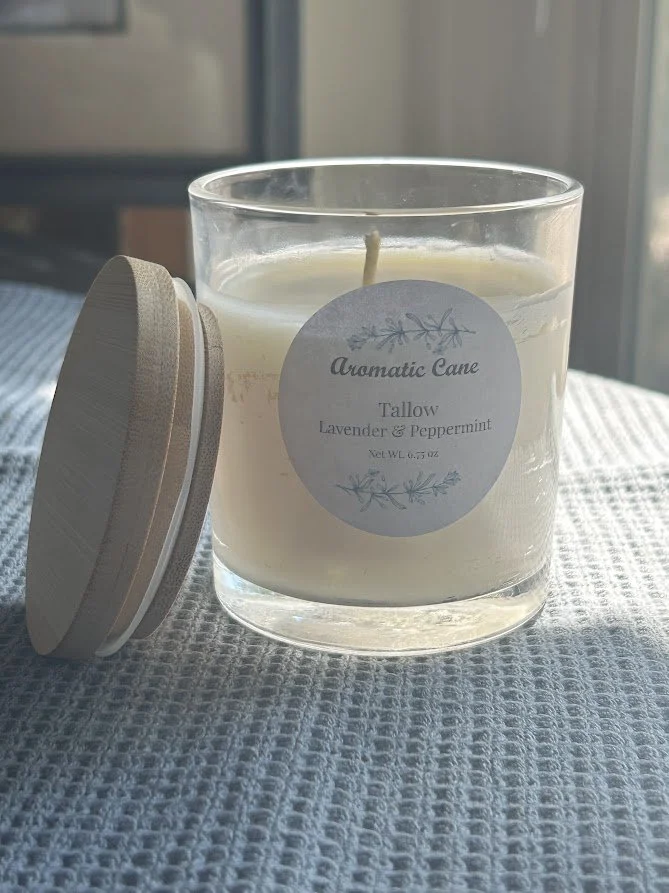 . This unique candle combines the long-lasting, clean-burning qualities of tallow and beeswax using a hemp wick, ensuring a steady, bright flame with minimal smoke.